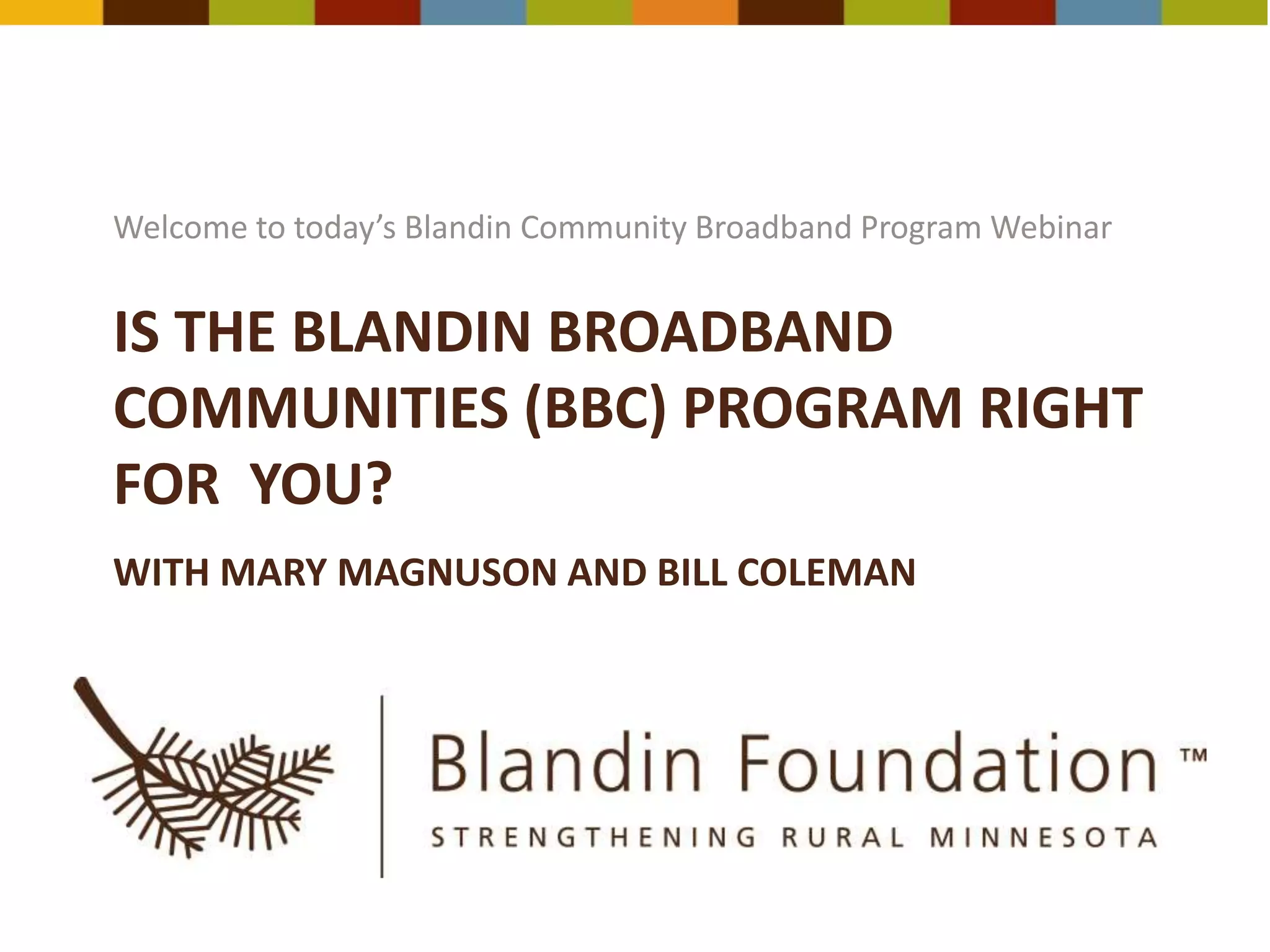 The Blandin Broadband Communities (BBC) program aims to enhance universal access to high-speed internet for all Minnesotans by partnering with local communities over a two-year period. The program supports various initiatives, including providing grants for broadband projects, facilitating community planning, and offering technical assistance to improve broadband infrastructure. The Blandin Foundation commits $450,000 annually for broadband grants and hosts conferences and webinars to support ongoing community engagement.