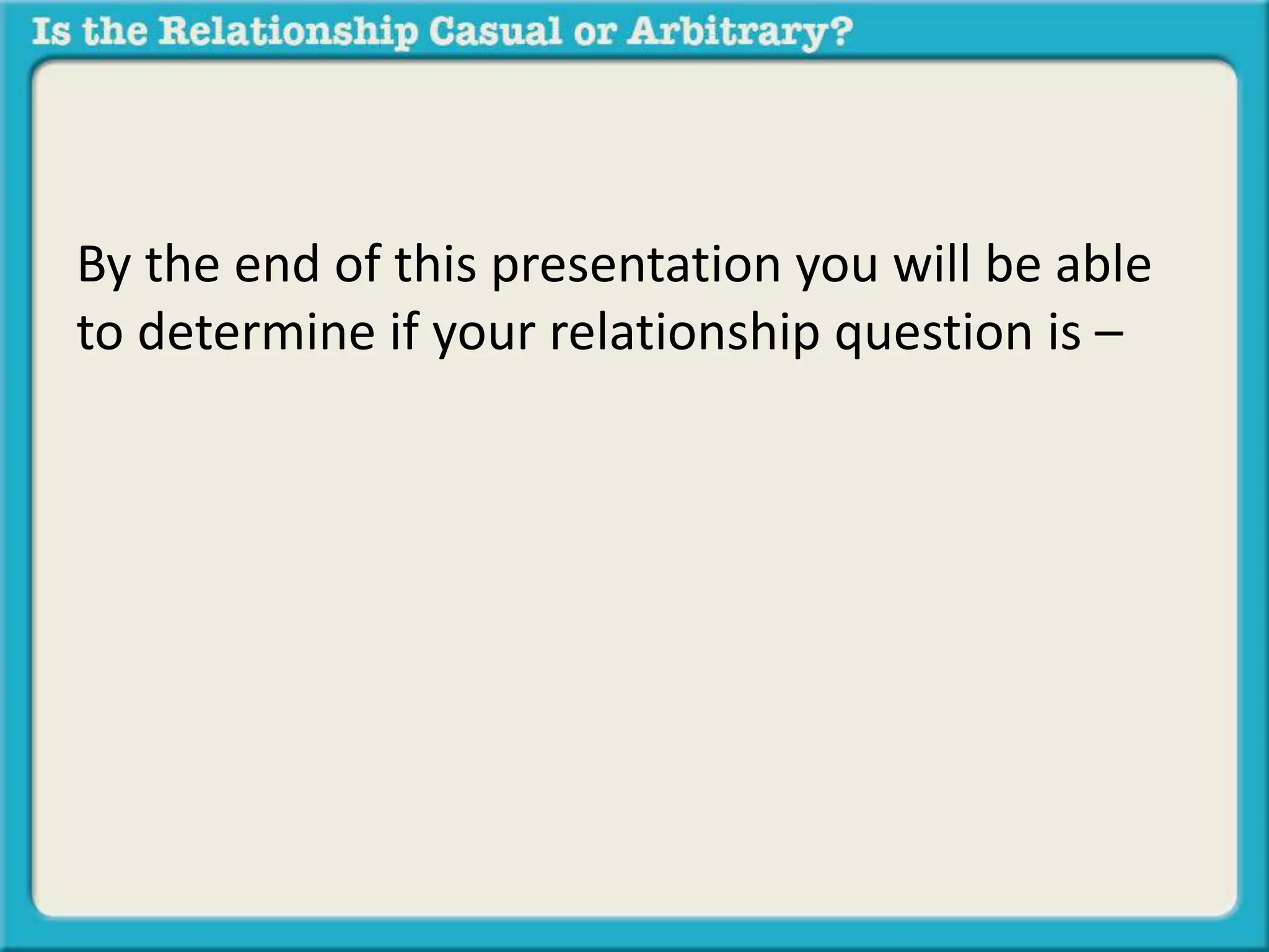 This document discusses the difference between causal and arbitrary relationships. A causal relationship is when one variable directly causes another, like higher temperatures causing ice to melt. An arbitrary relationship is when two variables are correlated but it is unclear which influences the other, such as anxiety and depression where they likely influence each other. The document provides examples of questions that indicate a causal relationship through wording like "predicts" and advises that most relationship questions in social sciences actually refer to arbitrary relationships rather than truly causal ones.