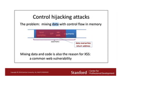 The document outlines essential considerations for reviewing code for security issues, emphasizing the importance of threat modeling, penetration testing, and proper input handling. Key areas to focus on include authentication, authorization, data leaks, dependency management, configuration, and caching issues. It provides practical tips for security awareness and improving security practices during code reviews.