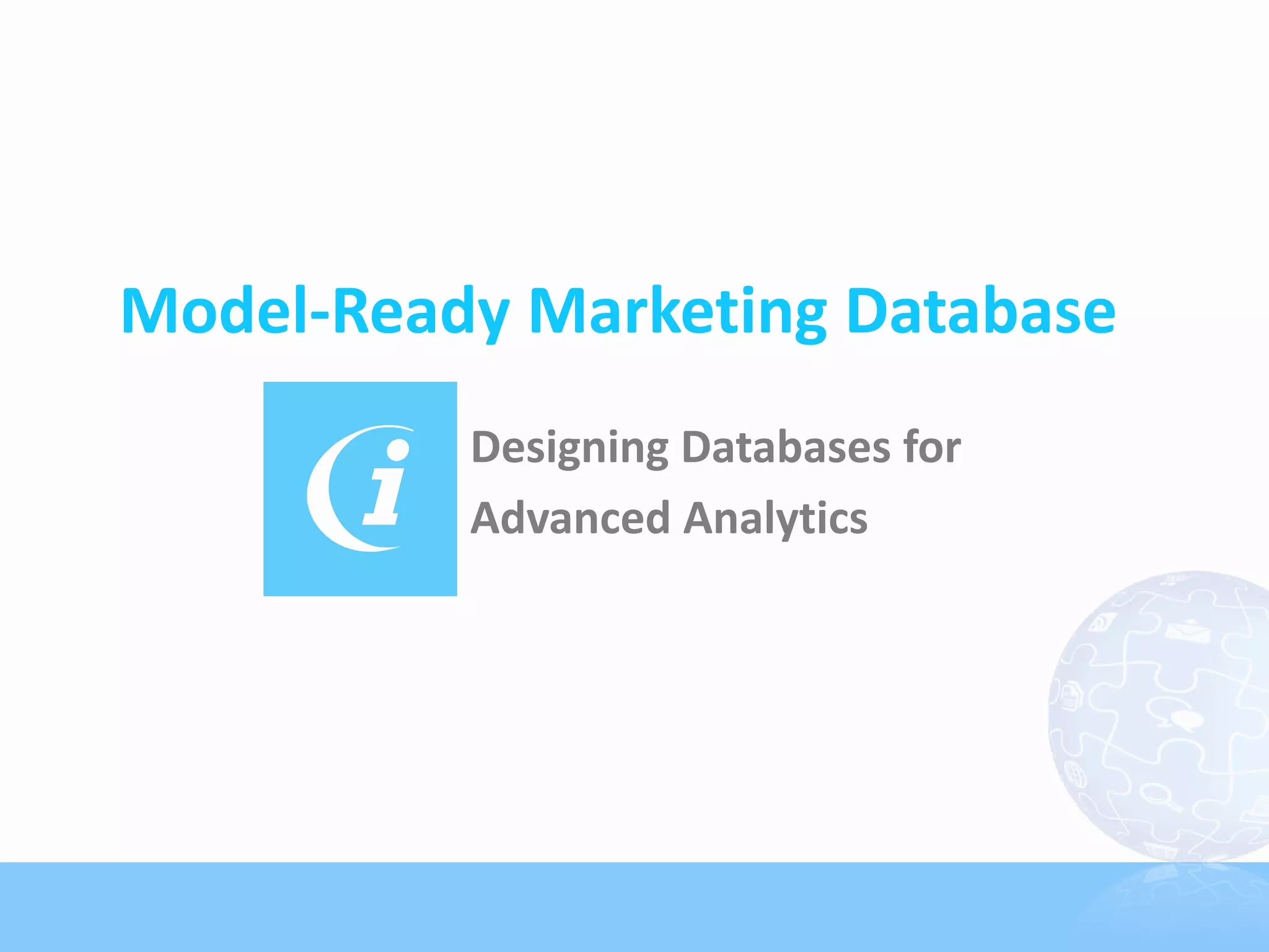 The document provides guidance on designing marketing databases to support advanced analytics and predictive modeling. It emphasizes the importance of cleaning and summarizing raw data into descriptive variables matched to the level that needs to be ranked, such as individuals or households. Transaction and customer history data should be converted into summary descriptors like recency, frequency, and monetary variables. This prepares the data for predictive modeling to increase targeting accuracy, reduce costs, and reveal patterns. Consistency in data preparation is highlighted as key for modeling effectiveness.