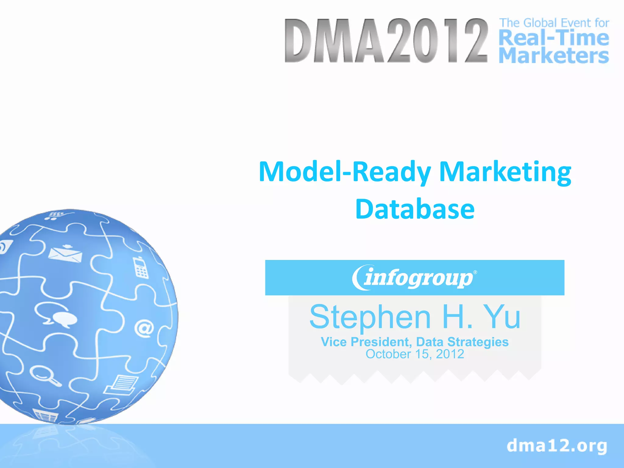 The document provides guidance on designing marketing databases to support advanced analytics and predictive modeling. It discusses the importance of collecting the right data ingredients, summarizing and categorizing variables, and ensuring consistency. Different types of analytics and variables are described, along with challenges in implementing models and what a "model-ready" database environment entails.