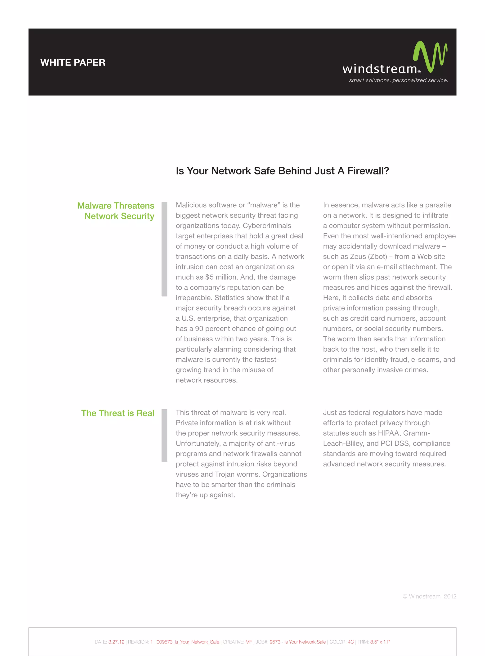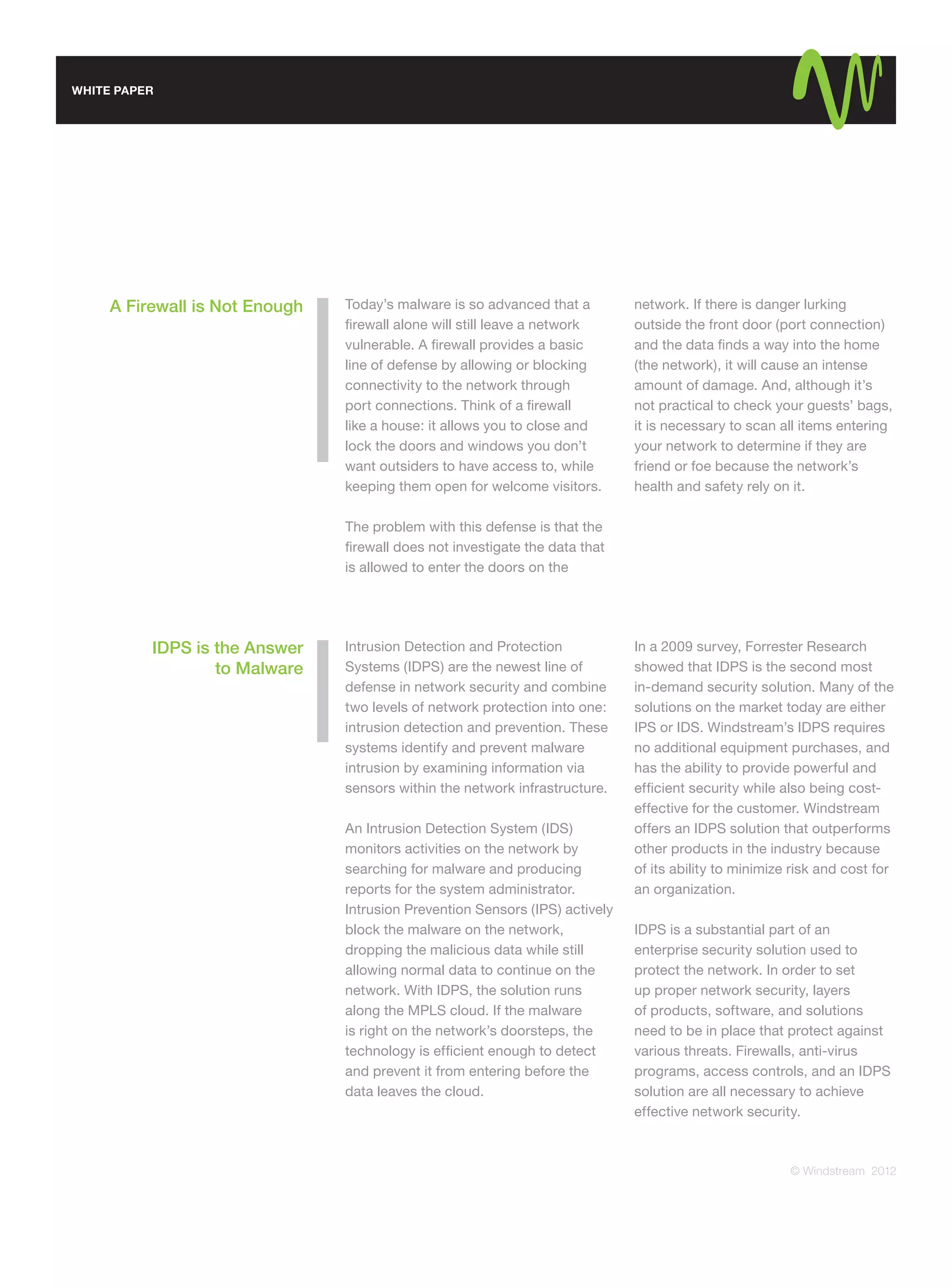 This document discusses the threats of malware to network security and argues that firewalls alone are not enough protection. It introduces intrusion detection and protection systems (IDPS) as the newest line of defense that can identify and prevent malware intrusion by examining network infrastructure. An IDPS solution scans for known threats, searches for anomalies, and actively blocks malware while allowing normal data. The document claims Windstream's IDPS requires no additional equipment, is cost-effective, and outperforms other products by minimizing risk.