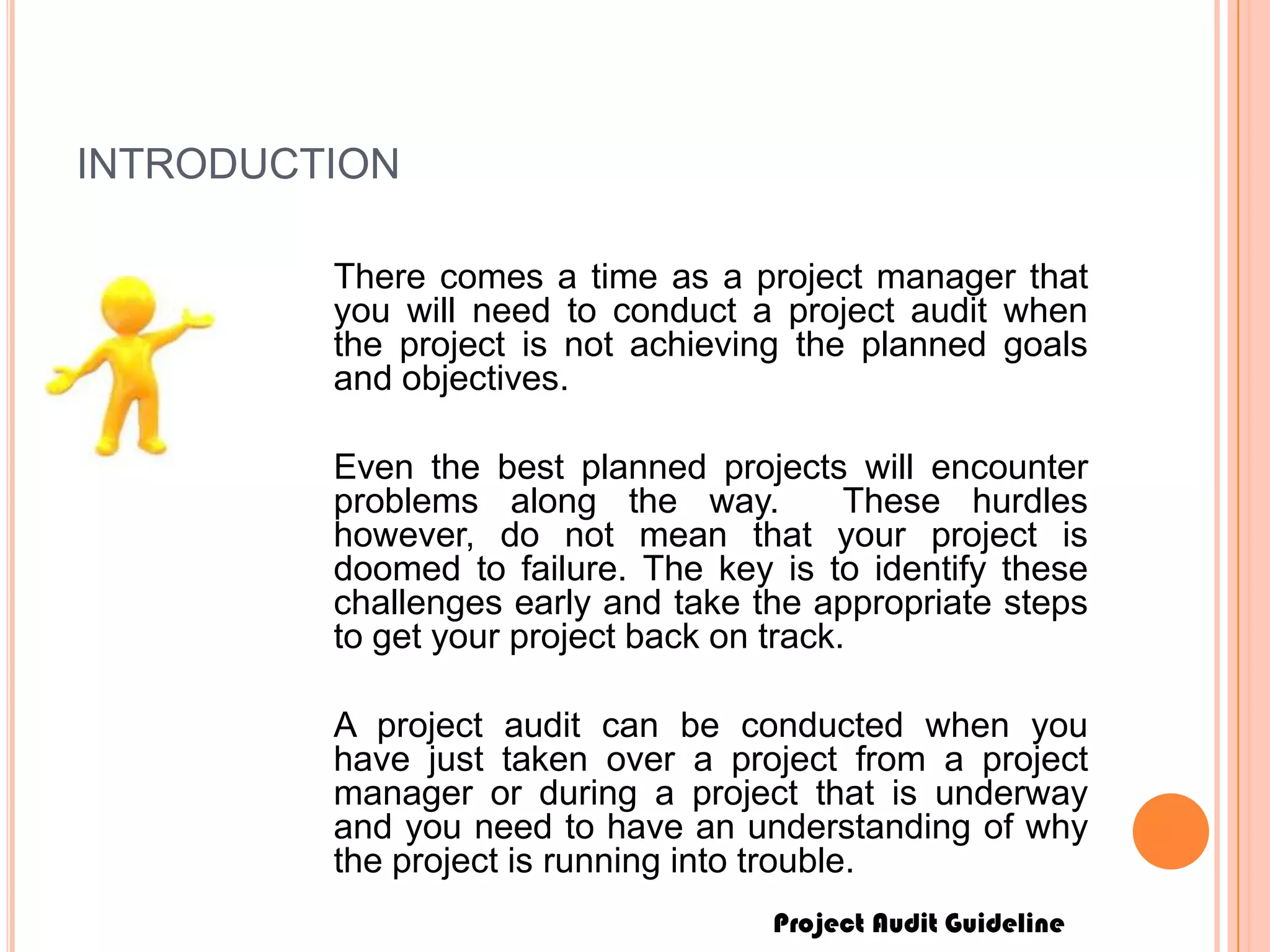 The document outlines guidelines for conducting a project audit aimed at identifying challenges and implementing corrective actions to realign projects with their goals. It provides structured steps for the audit process, from defining the audit charter to presenting findings and implementing approved plans. Additionally, it lists indicators of troubled projects and key questions to assess various project management aspects for improvement.