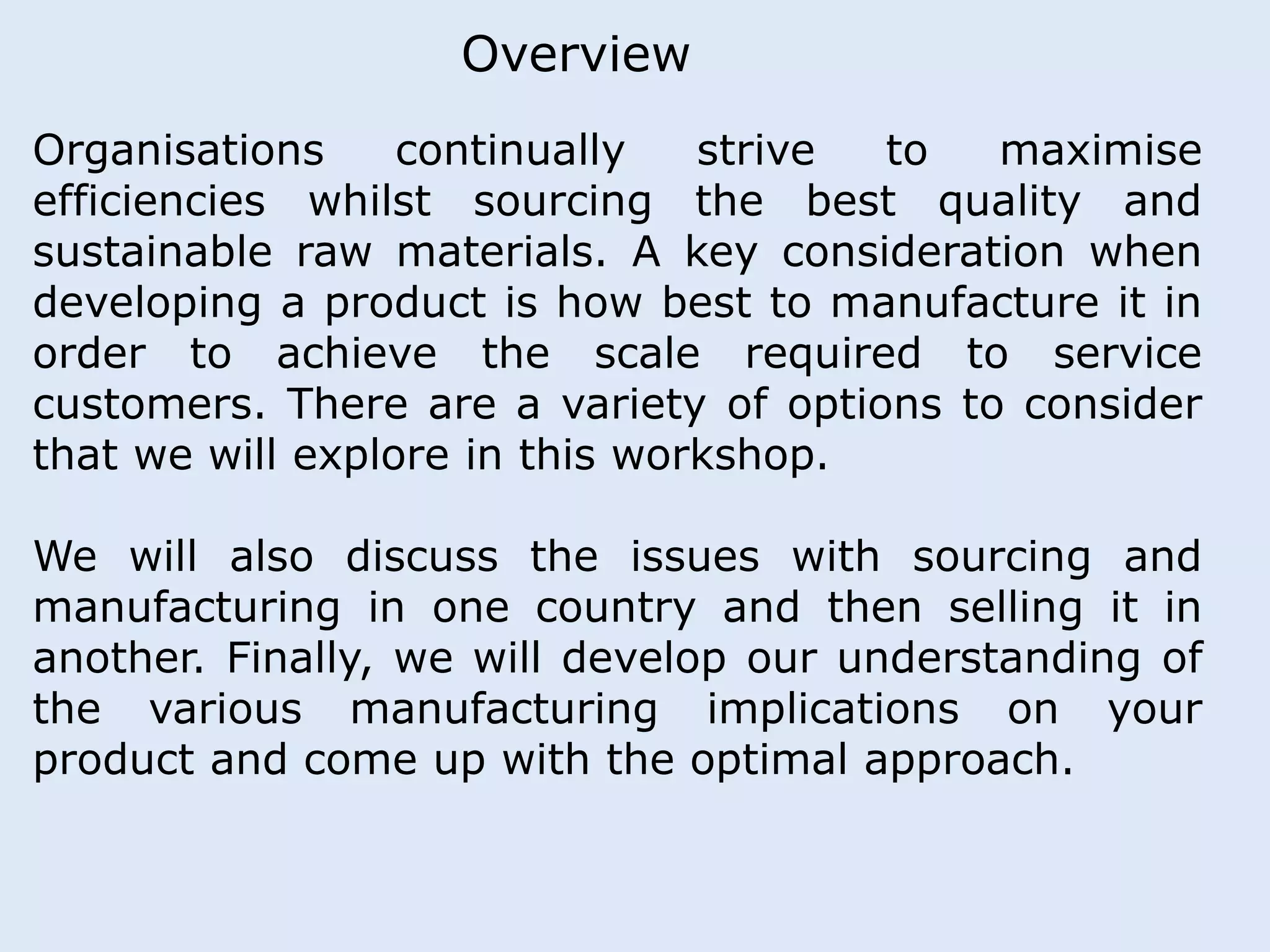 This document discusses various manufacturing considerations for organizations. It explores options for sourcing raw materials from around the world to maximize efficiencies. Manufacturing options that are evaluated include outsourcing production, insourcing production, and a hybrid model. Key factors that are examined for each option include implications, pros and cons, and examples. Additionally, considerations for whether to manufacture in the home country or host country based on stage of growth are reviewed. Tools like demand forecasting and assessing local trade barriers are also emphasized.