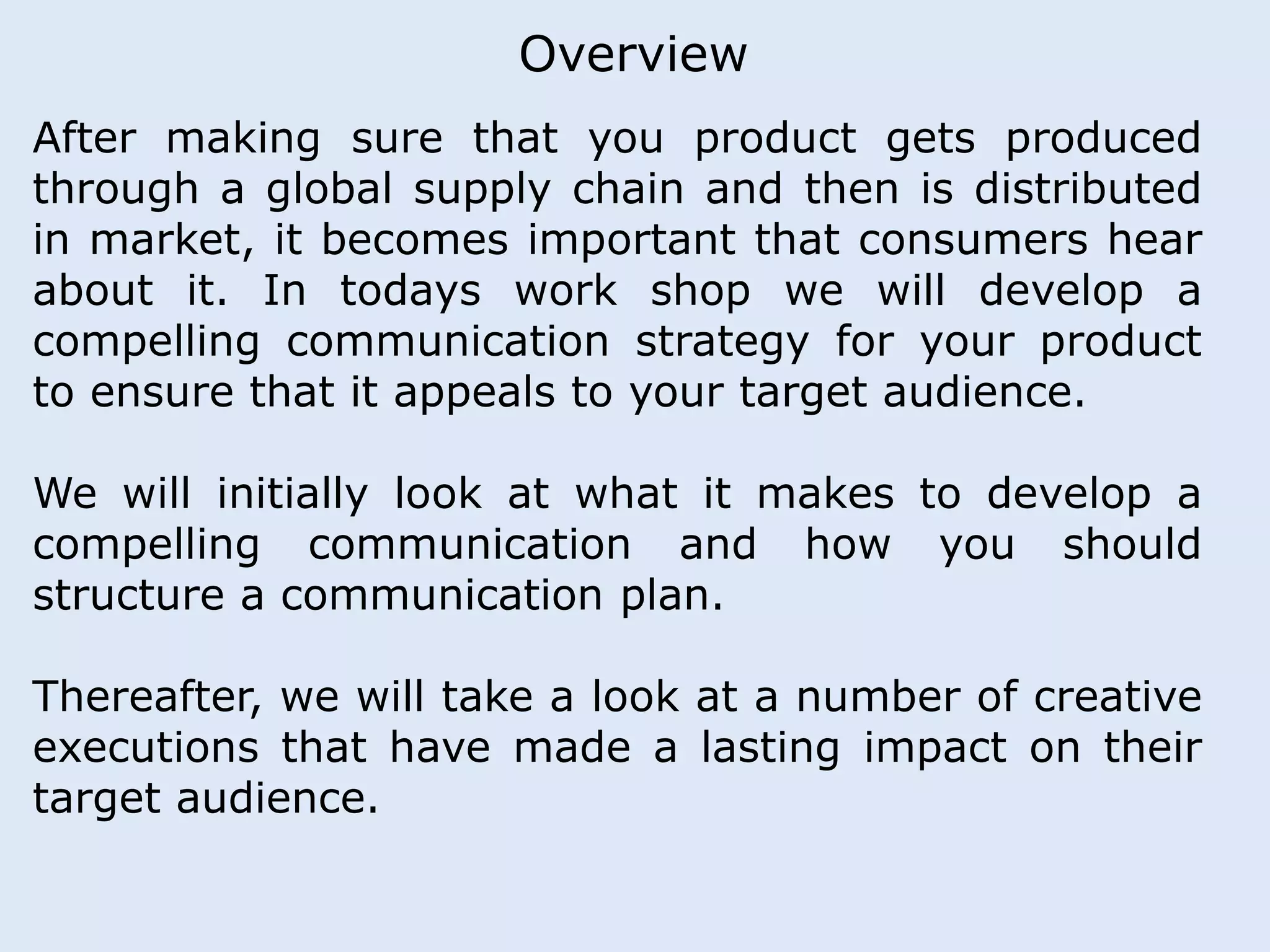 This document provides an overview of a workshop on developing communication plans for products. The workshop will help participants create compelling communication strategies by looking at what makes an effective strategy, examples of creative executions, and how to structure a communications brief. The brief outlines key information like objectives, target audiences, insights, messaging, budget and timing. Participants will analyze sample ads, consider their creative approach, and provide feedback on their ideas. The goal is for participants to understand the full communication process and be able to build plans to promote their products.