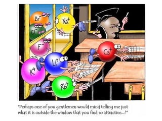 Ionic bonding occurs when atoms gain or lose valence electrons to achieve stable noble gas configurations, becoming ions. Cations are positively charged ions formed when atoms lose electrons, while anions are negatively charged ions formed when atoms gain electrons. Ionic compounds are formed from electrostatic attractions between cations and anions, resulting in electrically neutral compounds. Ionic compounds usually have high melting points and conduct electricity when molten or dissolved in water.