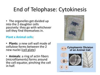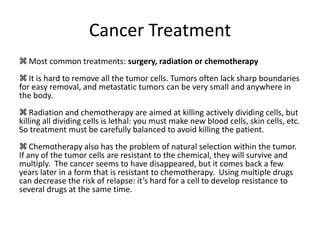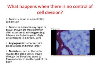 Cell division occurs through mitosis and cytokinesis to allow for growth, reproduction, and replacement of damaged or dead cells. Mitosis involves four phases - prophase, metaphase, anaphase, and telophase - where chromosomes are aligned and separated. Cytokinesis then divides the cytoplasmic components between the two daughter cells. Uncontrolled cell division can lead to tumor formation, which can grow large by recruiting blood vessels and metastasize by spreading to other parts of the body through the bloodstream. Common cancer treatments include surgery, radiation, and chemotherapy to kill actively dividing tumor cells, though it is difficult to remove all cancer cells and treatment must be carefully balanced.