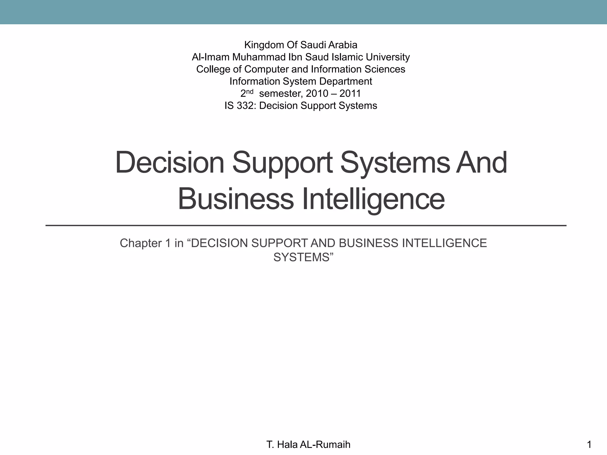 1. This document discusses decision support systems and business intelligence. It introduces the business pressures-responses-support model and explains how computerized support helps organizations respond quickly to changing business environments.