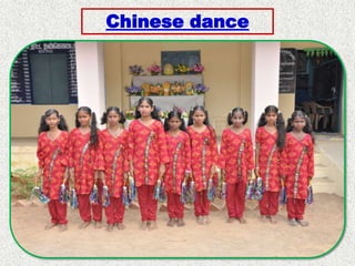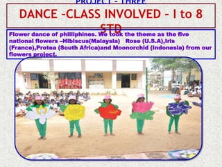 The document outlines a series of cultural dance and festival projects involving students from various grades, focusing on international traditions such as the flower dance of the Philippines and the dragon dance of China. Activities included preparing cards for Christmas, celebrating the Tomato Festival of Spain, experiencing the Chinese New Year, and flying kites decorated with flags from different countries. Overall, the projects fostered appreciation for global cultures and included evaluations through competitions like speeches and quizzes.