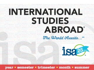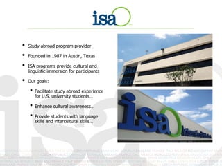 ISA is an international education provider founded in 1987 that operates study abroad programs in 21 countries and 36 cities. They aim to facilitate cultural immersion and language learning for students through housing placements, excursions, on-site support staff, and academic coursework at host universities. ISA provides extensive support services to students during and after their study abroad experiences.