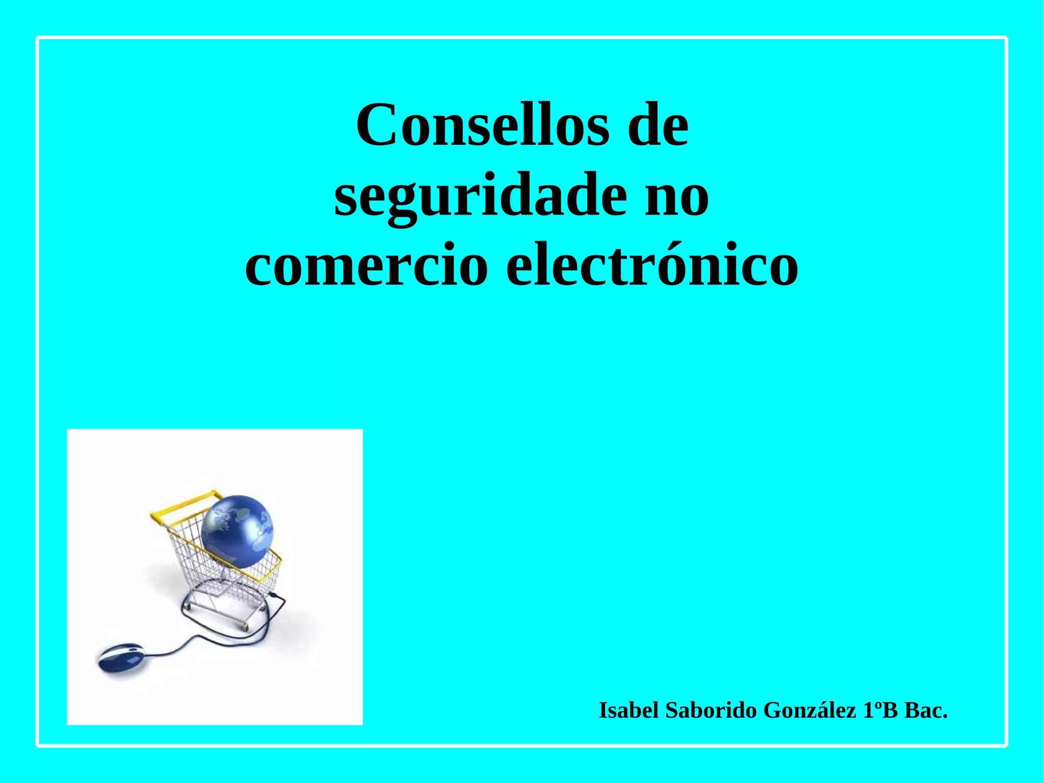 Isa presentación 1. 2. comercio electrónico consite na compra e venta de productos e servizos a través de medios electronicos,tales como internet e outras redes informáticas. 3. A maior parte do comercio electrónico consiste na compra e venta de productos e servicios entre persoas e empresas sin embargo hai unha parte que consiste na adquisición de articulos virtuais. 4. A seguridade no comercio electrónico é un aspecto de suma importancia para iso é preciso dispoñer dun servidor seguro a través do cal toda a información confidencial é encriptada e viaxa de formar segura esto brinda confianza tanto a proveedores como a compradores.
