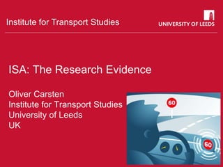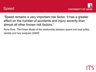 The document discusses the significant impact of speed as a risk factor for road safety, emphasizing that accident severity increases with speed. It presents data from various trials on Intelligent Speed Assistance (ISA) systems, demonstrating their effectiveness in reducing accident rates when regulated properly. Conclusions highlight the necessity of adopting legislation for ISA systems in vehicles to maximize safety benefits across Europe.