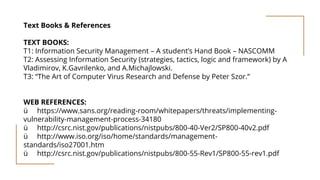This document discusses security metrics for assessing information security. It begins by explaining why security metrics are important for measuring the effectiveness of security programs and benchmarking security investments. It then categorizes metrics according to their level and type, such as strategic, management, and operational metrics. Examples are provided for each category and type, including process, network, software, and people security metrics. Common issues in generating metrics and critical elements like asset value, threats, and vulnerabilities are also addressed.