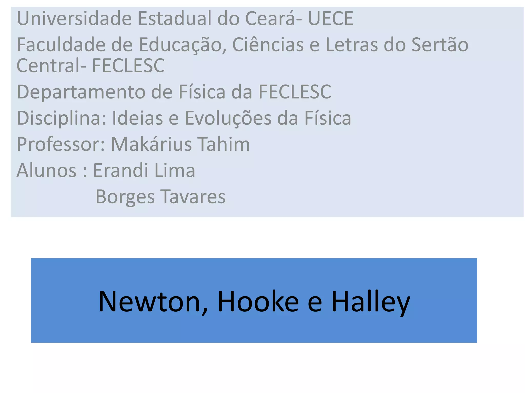1) O documento descreve as vidas e contribuições científicas de Isaac Newton, Robert Hooke e Edmond Halley, reconhecidos físicos do século XVII.