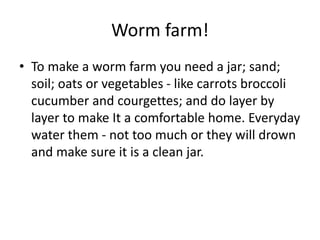 The document describes a child making a worm farm by collecting worms from the garden and placing them in a jar with layers of oats, sand, and soil so the worms have something to eat and can survive. Photos document the different steps of collecting worms, putting them in the jar, and ensuring the worms are comfortable in their new home.
