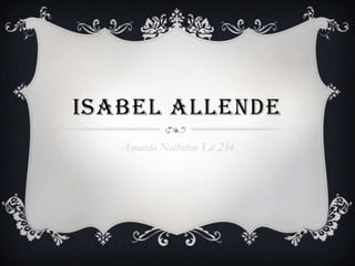 Isabel Allende is a Chilean-American author born in 1942 in Lima, Peru. She received Chile's National Literature Prize in 2010 and was inducted into the American Academy of Arts and Letters in 2004. Allende founded the Isabel Allende Foundation in 1996 to support programs helping women and children. She writes primarily in the style of magical realism and has authored over 20 novels translated into over 30 languages, selling over 56 million copies worldwide.