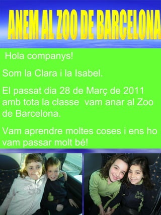 Hola companys! Somla Clara i la Isabel. El passat dia 28 de Març de 2011 amb tota la classe vam anar al Zoo de Barcelona. Vam aprendre moltes coses i ens ho vam passar molt bé! ANEM AL ZOO DE BARCELONA