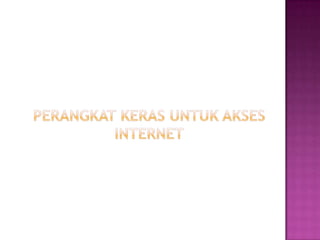 Internet merupakan jaringan komputer global yang menghubungkan komputer dari seluruh dunia untuk berbagi informasi. Pengguna dapat melakukan berbagai aktivitas seperti mencari informasi, berbelanja, berkirim pesan, dan berkomunikasi dengan orang lain melalui internet. Perangkat keras dan jaringan yang mendukung koneksi internet antara lain modem, saluran telekomunikasi, router, dan kabel.