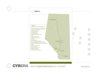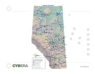 The document provides an overview of an organization with the mission to spur innovation for Alberta's economic benefit through cyberinfrastructure. It discusses goals of sustainable operations through grant renewals and member support. Revenue is generated through memberships and government funds. Best practices from other organizations around backup services, peering, and on-demand high performance computing are also presented.