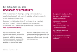 The document outlines the benefits of obtaining ISACA certifications such as CISA, CISM, CGEIT, and CRISC, highlighting their impact on career advancement, earning potential, and professional credibility within the IT industry. It emphasizes the increasing demand for qualified IT professionals amid complex technological challenges and the value these certifications offer in demonstrating expertise. Additionally, it provides information on upcoming exam dates and encourages individuals to enroll in ISACA's certification programs for greater career opportunities.