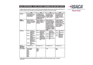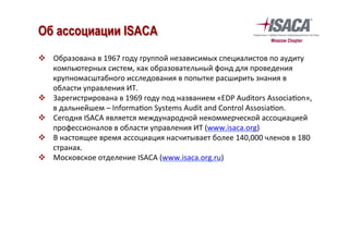 Документ представляет информацию о международной некоммерческой ассоциации ISACA, основанной в 1967 году, и акцентирует внимание на ее роли в области управления IT, аудита и информационной безопасности. ASACA предлагает профессиональные сертификации, такие как CISA, CISM и CGEIT, а также организует обучение и конференции для своих членов. Кроме того, документ указывает на преимущества сертификаций на глобальном рынке труда и описывает условия их получения.