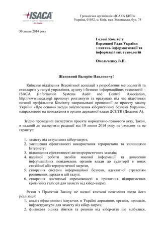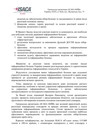 Київське відділення Всесвітньої асоціації з розроблення методологій та стандартів у галузі управління, аудиту і безпеки інформаційних технологій – ISACA (Information Systems Audit and Control Association, http://www.isaca.org) пропонує розглянути та врахувати під час підготовки позиції профільного Комітету напрацьовані пропозиції до проекту закону України «Про основні засади забезпечення кібернетичної безпеки України», направленого на погодження в органи державної влади ДССЗЗІ