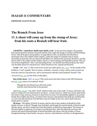 This document provides commentary on Isaiah 11 from multiple scholars. It begins by summarizing the passage, noting it refers to a shoot or branch that will come from Jesse's roots, referring to the Messiah arising from David's lineage when his family had fallen. Multiple scholars and commentaries are then excerpted explaining why this refers to the Messiah based on context and references in other passages, as well as the qualities described not matching any other figures. The commentary discusses the imagery of the weak shoot or branch and fallen house of David representing Christ's humble origins.