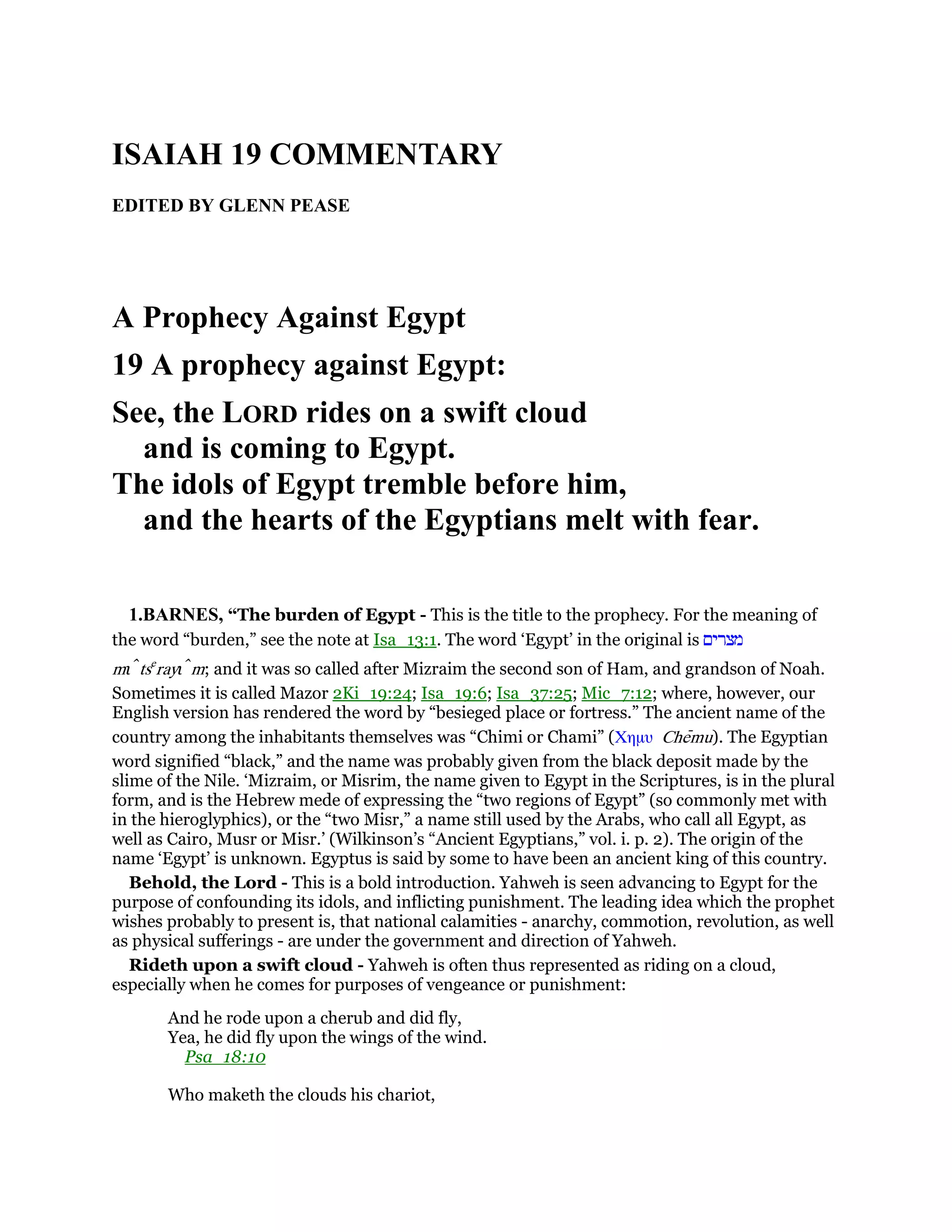The document provides commentary on Isaiah 19, which contains a prophecy against Egypt. It begins by explaining the meaning and origins of the name "Egypt" and discussing how God is depicted as riding upon a cloud when coming to inflict punishment. It then analyzes each verse and explains what judgments God will bring against Egypt, including causing their idols to tremble and the people's courage to fail. The commentators discuss how this prophecy refers to divisions and civil wars in Egypt as well as the Assyrian invasion during the time of Isaiah.