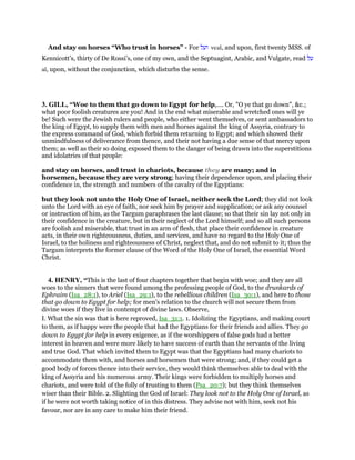 This document provides commentary on Isaiah 31 from multiple scholars. It discusses the sin of relying on Egypt for help rather than trusting in God. The Israelites went down to Egypt for military assistance with horses and chariots against the Assyrians, despite being forbidden to do so. They did not seek God's counsel or make Him their friend. Relying on human strength and allies goes against relying on the Holy One of Israel, who is all-powerful and wise. Egypt and its forces are merely mortal while God is immortal.