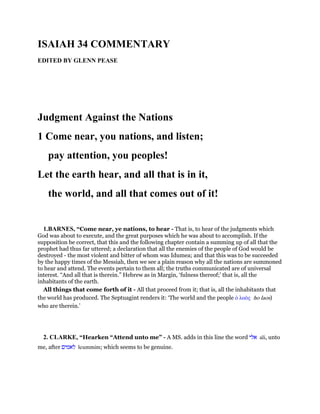 This document provides commentary from multiple scholars on Isaiah 34, which prophecies judgment against the nations. Specifically, it focuses judgment on Edom as a representative of God's enemies. The chapter begins by calling all nations and the earth to hear of God's coming wrath and destruction against those who oppose his people. It then depicts the terrible fate in vivid imagery that will befall Edom and the enemies of God, with their corpses left unburied and mountains melting from their blood. The judgment serves as a warning to all nations and a sign of God's vengeance on those who harm his people. Edom symbolizes the perpetual enemies of Israel and God's righteous punishment of the wicked.