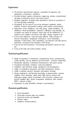 Islam Abdelhaliem Ali Rashed is a highly motivated and goal-oriented professional with over 10 years of experience in instrumentation and control engineering. He has worked on projects in Egypt for clients such as ENI, BP, and PHPC. His experience includes commissioning, maintenance, and troubleshooting of instrumentation systems for LNG, gas, and industrial plants. He has strong technical skills in instrumentation design, calibration, loop checking, and preventative maintenance. He is proficient in MAXIMO and holds certifications in measurement and control fundamentals, networking, and safety training.