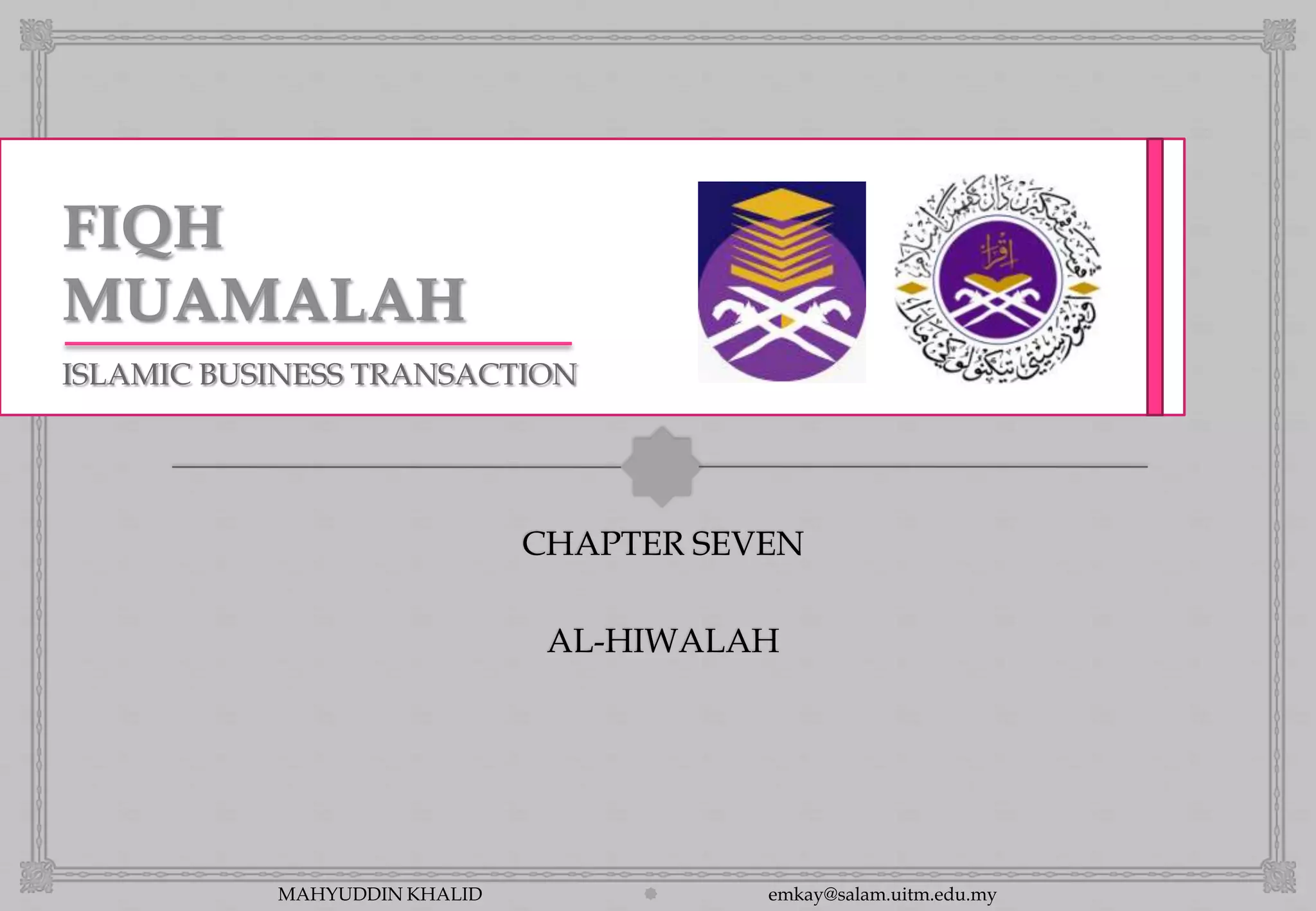 This document discusses the Islamic business transaction of al-hiwalah. It begins by defining al-hiwalah as the transfer of a debt from one debtor to another, which absolves the liability of the original debtor. The document then provides evidence for al-hiwalah from hadith and scholarly consensus. It outlines the key pillars and participants in an al-hiwalah contract, as well as categories of al-hiwalah like restricted and unrestricted. The document also examines conditions for a valid al-hiwalah contract and advantages it provides creditors and debtors. Finally, it states the legal consequences are the absolving of the original debtor's responsibility and establishing the creditor's right to demand repayment from