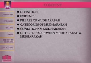 The document defines and discusses the concept of Mudharabah, which is a contract of partnership where one party provides capital and the other provides labor and management. It provides key details on the definition, pillars, categories, conditions and evidence for Mudharabah based on classical Islamic literature. The summary highlights that Mudharabah is a profit-sharing partnership where profits are shared according to a predetermined rate but losses are borne solely by the capital provider.
