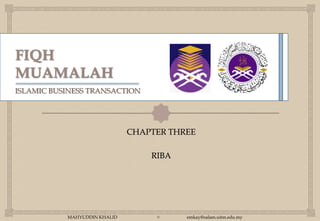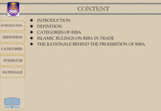 Riba refers to usury or interest charged on loans. It is prohibited in Islam based on evidence from the Quran and hadith. There are two main categories of riba - debt riba, which includes interest on loans, and trade riba, which involves unequal exchange of goods. Certain goods like gold, silver, wheat and barley are considered ribawi items where rules on quantity and time of exchange must be followed to avoid riba. The prohibition aims to prevent injustice and burden on borrowers that can destabilize societies.