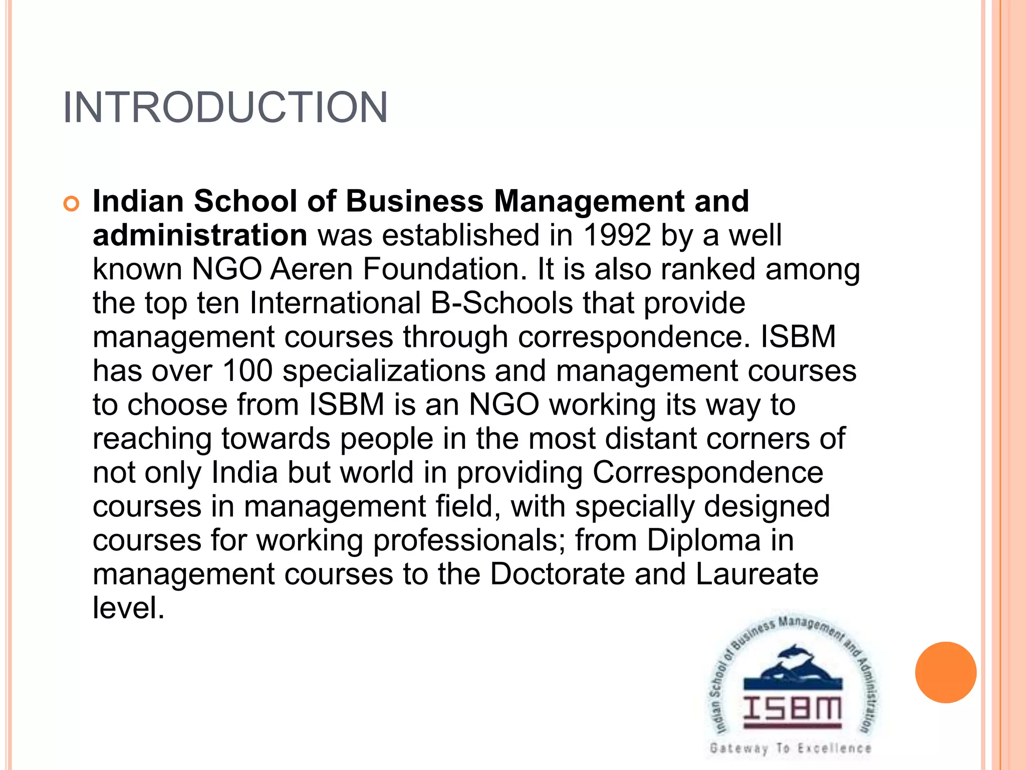 The Indian School of Business Management and Administration was established in 1992 by the Aeren Foundation. It offers over 100 correspondence courses in management from diplomas to doctorates. ISBM aims to provide management education to working professionals in India and around the world. It offers short, fast-track correspondence courses to help students gain management skills and become managers. The school hosts various events and programs in different management fields that attract many students who often find placements at top global companies after graduating.