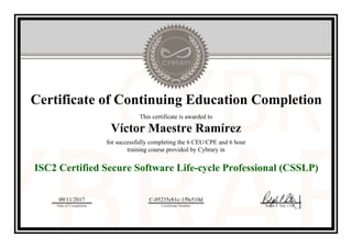 This certificate confirms that Víctor Maestre Ramírez completed a 6-hour, 6 CEU/CPE training course provided by Cybrary on the ISC2 Certified Secure Software Life-cycle Professional (CSSLP) on September 11, 2017. The certificate was issued by Ralph P. Sita, CEO of Cybrary.