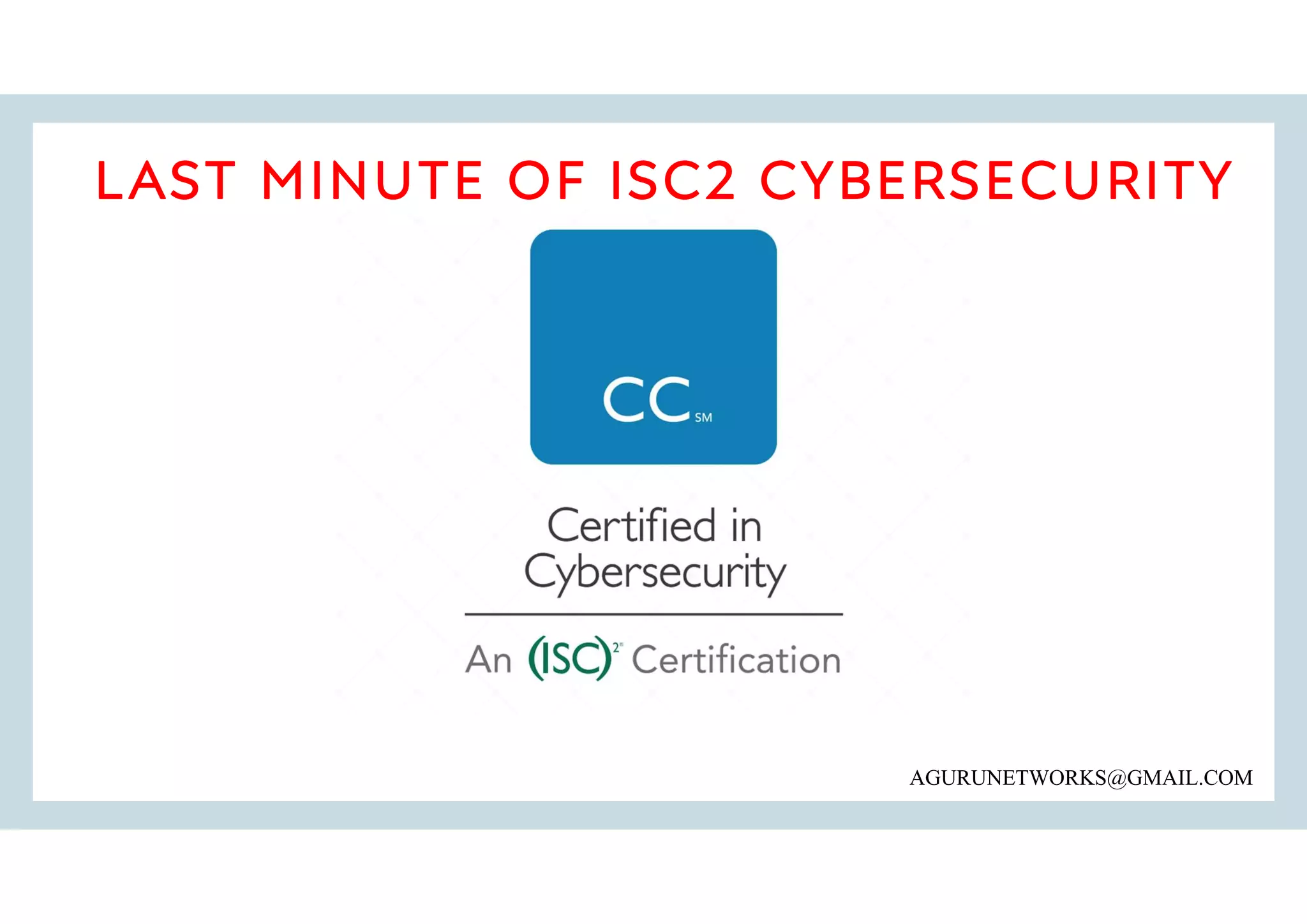 The document provides notes on topics for the ISC2 Cybersecurity exam, including a Udemy practice exam link. It covers the ISC2 Code of Ethics, the goals of information security (confidentiality, integrity, availability), common security threats and how to mitigate them. It also discusses authentication methods, risk assessment, security controls, security policies, business continuity planning, and other cybersecurity concepts.