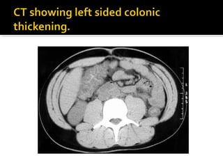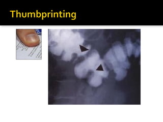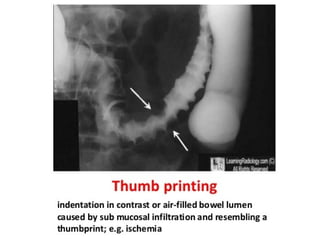 2. Symptoms include sudden onset of abdominal pain and bloody diarrhea, with physical exam possibly showing signs of peritonitis in severe cases. Plain abdominal films may show thumbprinting from hemorrhage.