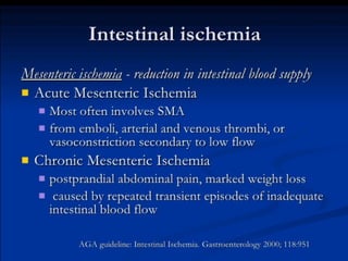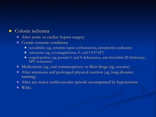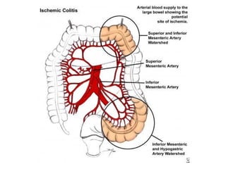 1. Ischemic colitis most often affects the elderly and is usually nonocclusive, with the most common cause being emboli cutting off blood flow.