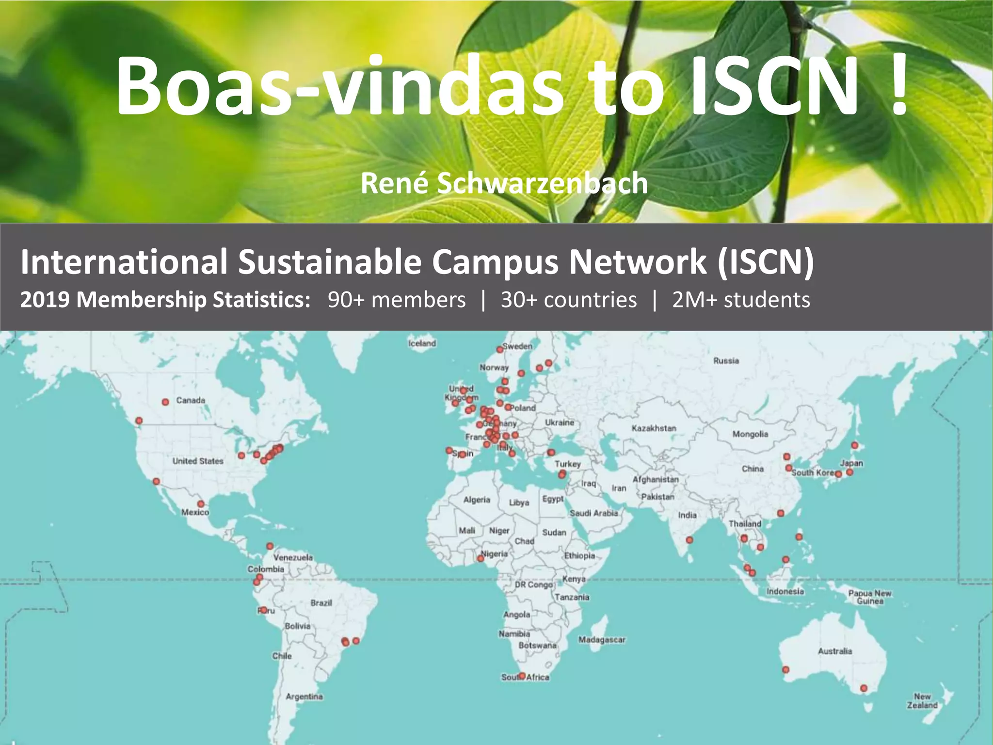The International Sustainable Campus Network (ISCN) is a nonprofit organization with over 90 member universities from 30+ countries representing over 2 million students. The ISCN was founded in 2007 and aims to help universities strengthen their efforts to address sustainability issues like the UN's Sustainable Development Goals. The ISCN holds annual conferences for member universities to collaborate on projects and works to increase its global membership, especially in the southern hemisphere. The upcoming conference in Sao Paulo will be an opportunity to further develop the ISCN's strategic plan and leadership structure to advance sustainability transformation in higher education worldwide.