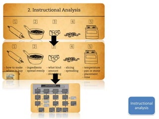 This document provides an overview of the ADDIE model for instructional design. It describes each phase of the ADDIE process: Analysis, Design, Development, Implementation, and Evaluation. For the Analysis phase, it outlines steps like conducting an instructional analysis, learner analysis, and writing learning objectives. The Design phase involves creating a blueprint or course map. In the Development phase, instructional materials are created. The Implementation phase involves testing the materials. Finally, the Evaluation phase consists of assessing the overall effectiveness of the instruction.