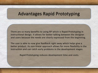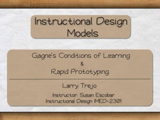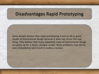 Gagné's model of instruction outlines nine events of instruction that correspond to different types of learning outcomes. These include gaining attention, informing learners of objectives, stimulating recall of prior learning, presenting stimuli, providing learning guidance, eliciting performance, providing feedback, assessing performance, and enhancing retention and transfer. Rapid prototyping is an instructional design approach where early versions or prototypes of instruction are created to identify design flaws and gain feedback before full development, allowing flexibility. Both models aim to improve their respective processes through a structured approach and iterative feedback.