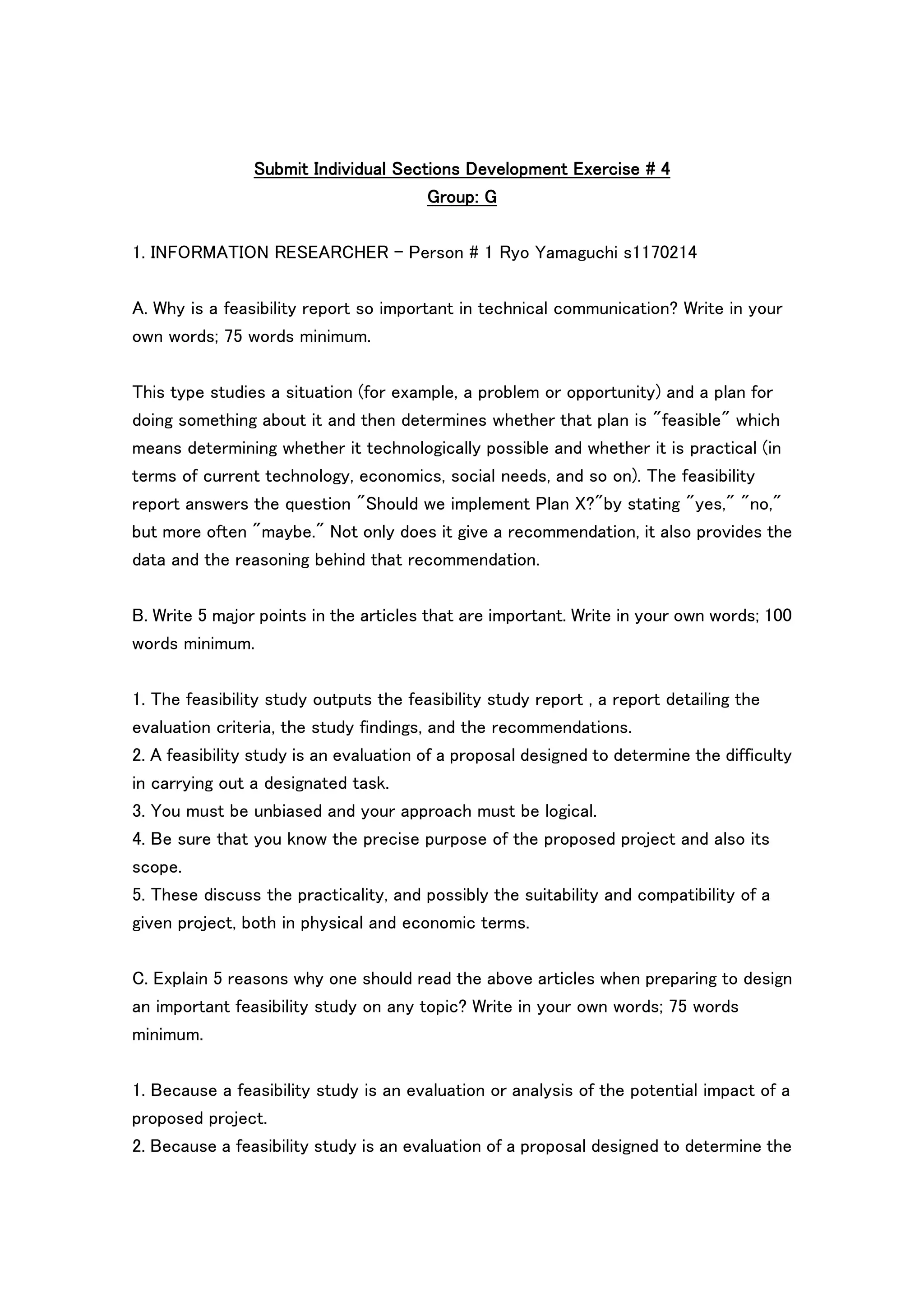 3. The document demonstrates collaboration between group members in preparing different components of a feasibility report for evaluation.