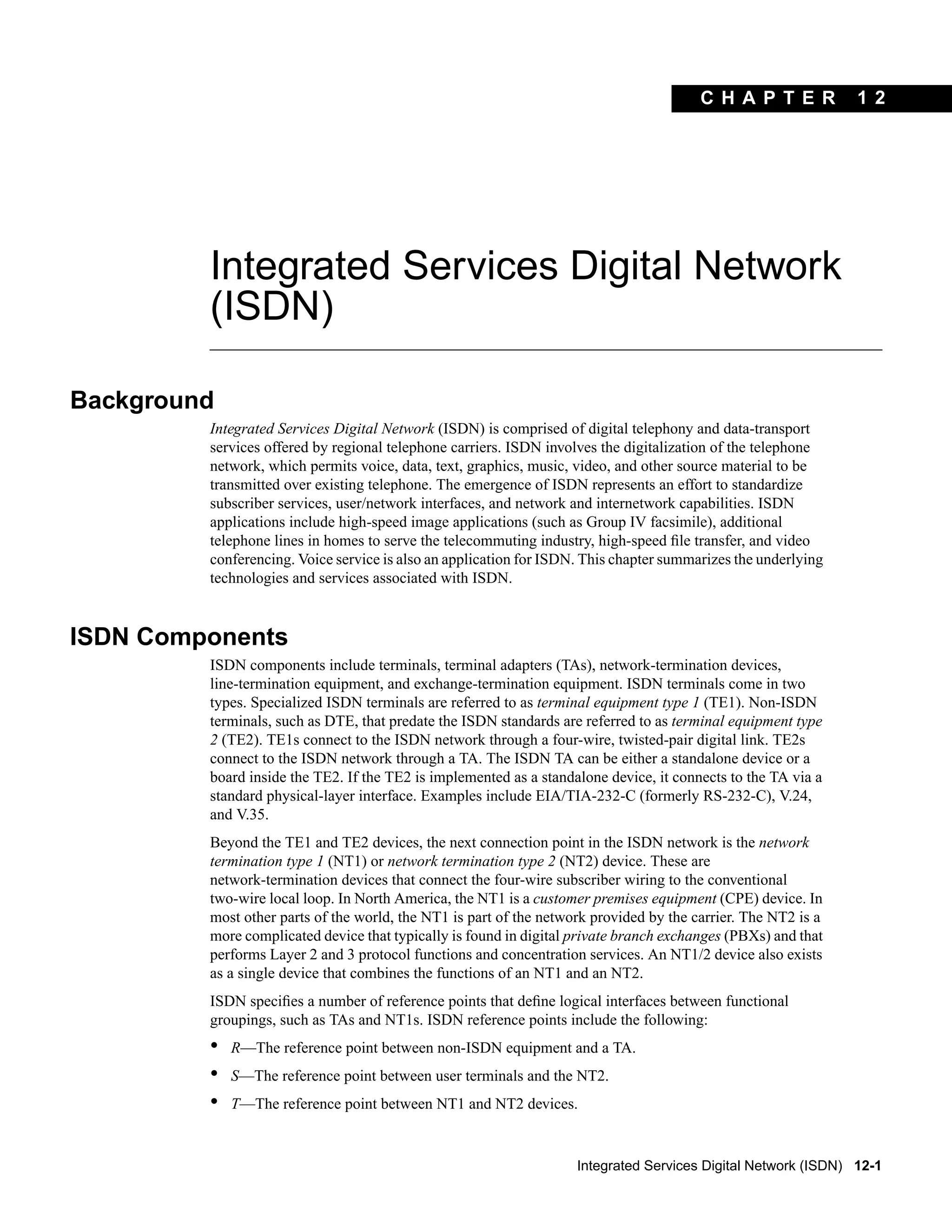 Integrated Services Digital Network (ISDN) provides digital telephony and data services over existing telephone networks. ISDN has several components including terminals, terminal adapters, and network termination devices. It specifies interfaces like the S reference point between terminals and network termination devices. ISDN offers Basic Rate Interface (BRI) and Primary Rate Interface (PRI) services. BRI provides 2 B channels for user data and 1 D channel for control, while PRI provides more B channels and higher speeds. ISDN uses protocols like LAPD at layer 2 and Q.930/Q.931 for circuit switching signaling.