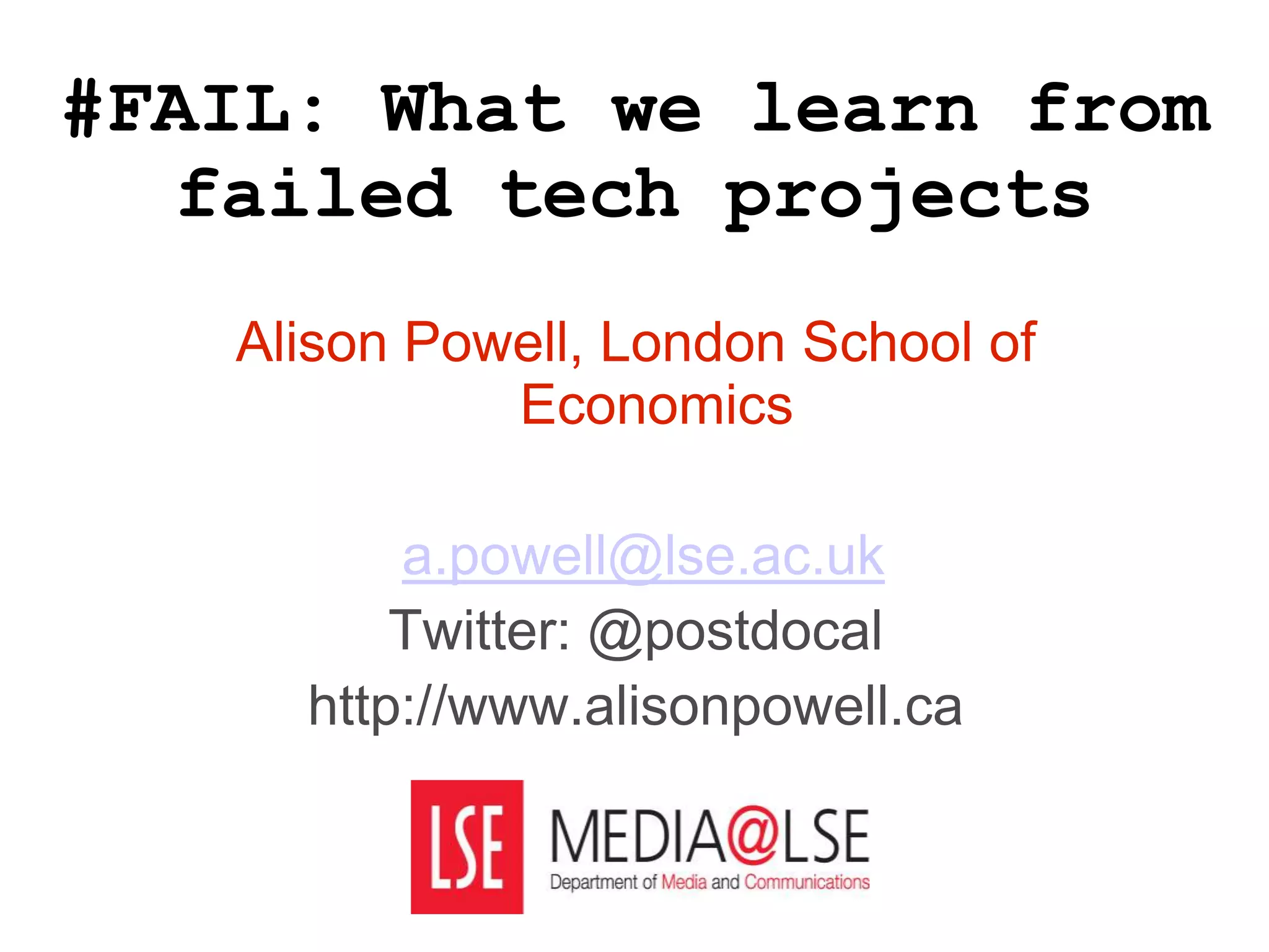 This document discusses failures in community wireless network (CWN) projects from 2000-2008 and proposes redefining failure. It presents a taxonomy of CWN project types and examples of notable failures, such as political CWNs in Berlin and Portland that were replaced by commercial networks. The author argues failures can still contribute value through transparent learning and that policy should consider unstated project goals, not just stated goals, when defining failure. The vision is to develop a new taxonomy that recognizes both planned and unplanned outcomes of seemingly failed projects.