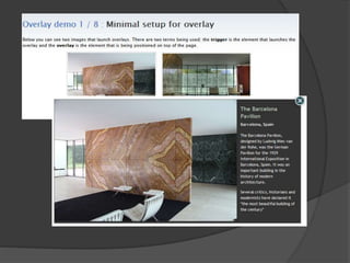 jQuery is a JavaScript library that simplifies HTML document traversal, event handling, animating, and Ajax interactions. It allows developers to perform tasks like DOM manipulation more easily compared to vanilla JavaScript. While JavaScript can perform the same tasks, jQuery provides easy-to-use functions and flexibility. jQuery can be used with many programming languages on both the client-side and server-side. It has features for DOM selection, traversal, modification, events, CSS manipulation, effects/animations, Ajax, and extensibility. Learning the basics of jQuery takes about a week, but fully exploring its functions takes more time. The jQuery library is freely available on its official website.