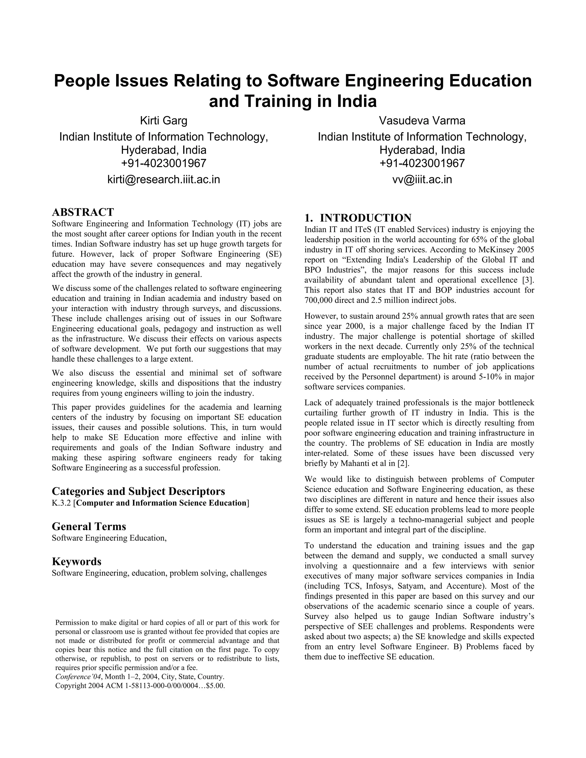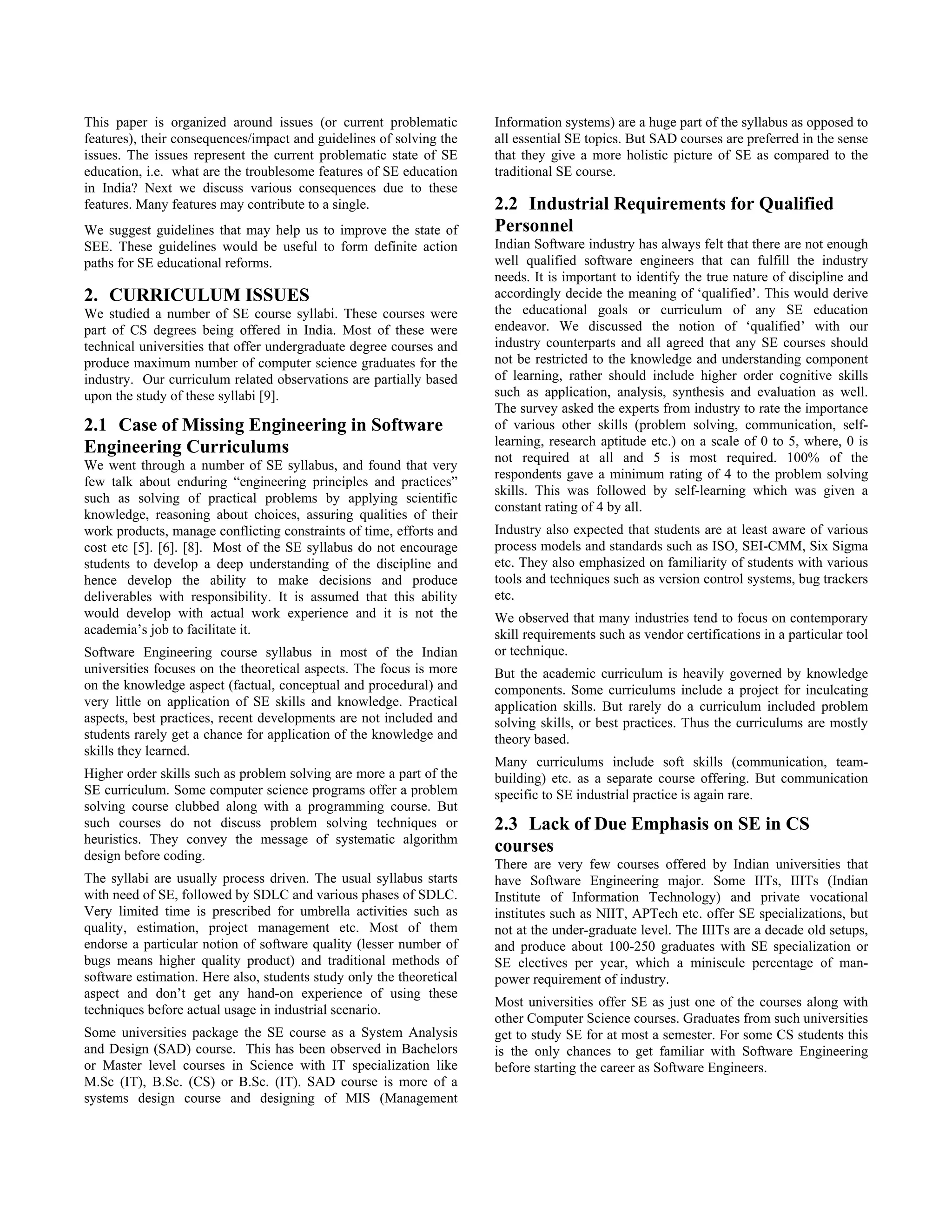 This document discusses challenges relating to software engineering education and training in India. It identifies several issues with SE curricula, including a lack of emphasis on engineering principles, problem solving skills, and practical application. It also notes a lack of qualified teachers, large class sizes, and short time allotted to SE courses. Additionally, the document discusses a mismatch between industry needs and the skills taught, as well as a lack of research emphasis in SE. Suggested solutions include reforming curricula to better align with industry requirements and incorporate more hands-on learning.