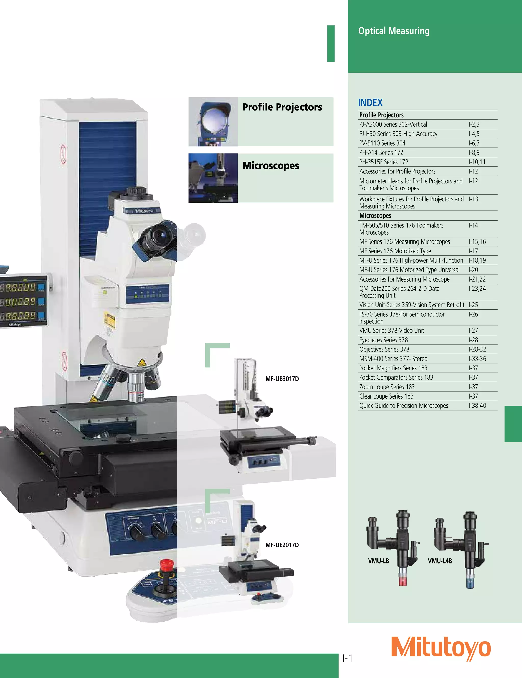 This document provides an index and specifications for various optical measuring instruments, including profile projectors and microscopes. It lists several models of profile projectors from the PJ-A3000 and PJ-H30 series, along with their specifications, optional accessories, and available fixtures. It also lists several models of measuring microscopes from the MF, MF-U, and MSM-400 series, along with their specifications and optional accessories. The document provides detailed information on the specifications, features, and options for these optical measuring instruments.