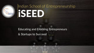 Indian School of Entrepreneurship (iSEED) provides structured entrepreneurship education programs to help entrepreneurs and startups succeed. Established in 2013, iSEED has grown to offer 7 flagship programs delivered through online and in-person methods. iSEED partners with top academic institutions and has a strong team with experience in academia, industry, and entrepreneurship. Their goal is to be a leading institution nurturing entrepreneurial mindsets through practical learning applied across all stages of venture development.