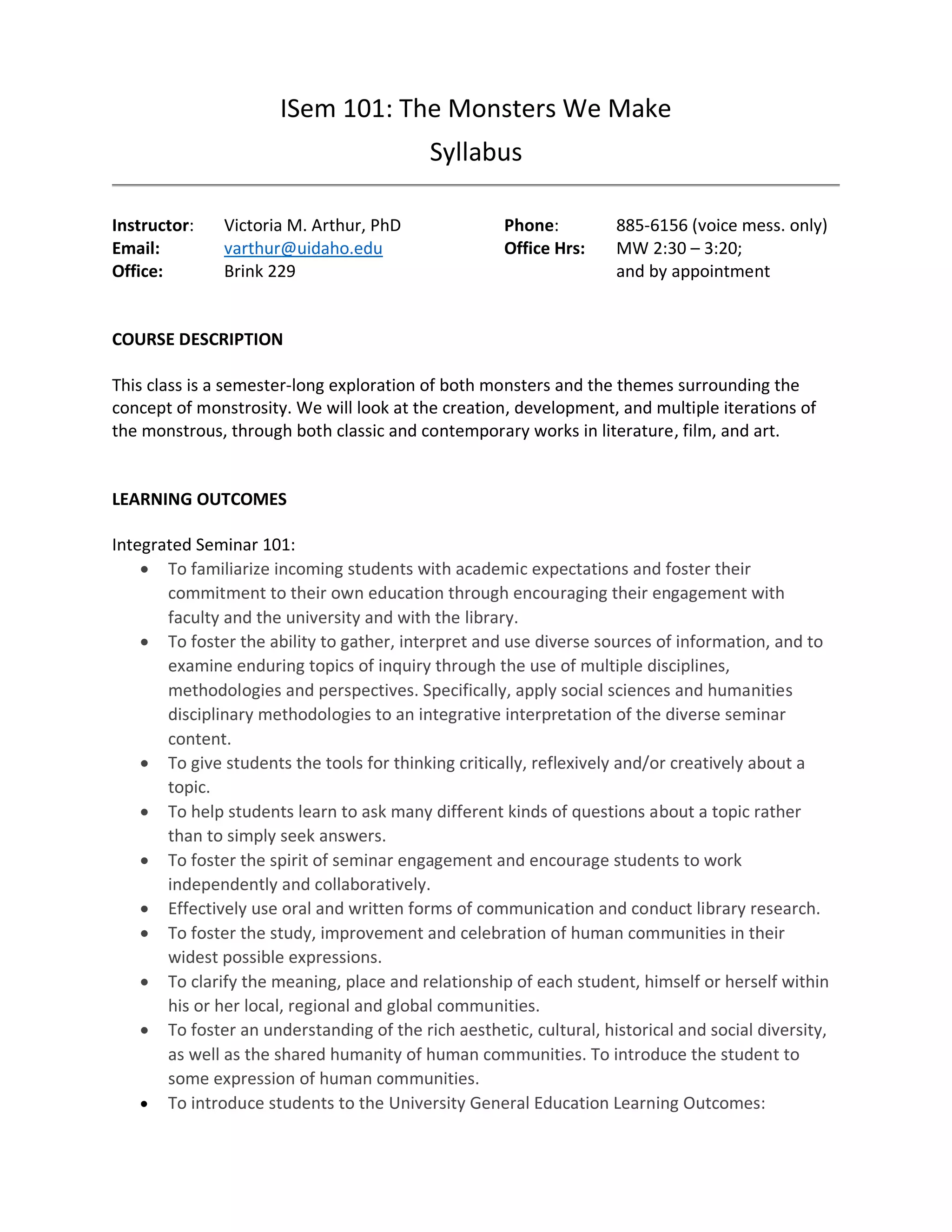 This syllabus outlines an integrated seminar course called "The Monsters We Make" that will explore concepts of monstrosity through literature, film, and art. Students will examine how monsters are created and developed across different works and time periods. The course learning outcomes include developing critical thinking skills, applying disciplinary methodologies, effective communication, and understanding diverse perspectives. Students will read Beowulf, Grendel, and I Am Legend, and complete projects on creative representation, analyzing a monster, a Grendel criminal case study, and a monsterpedia. Class participation, assignments, and major projects will be graded on a points system with letter grades assigned at the end.